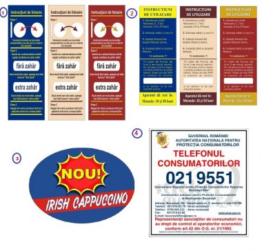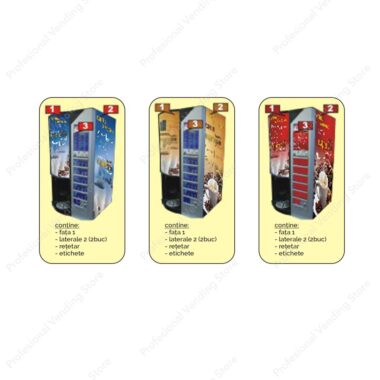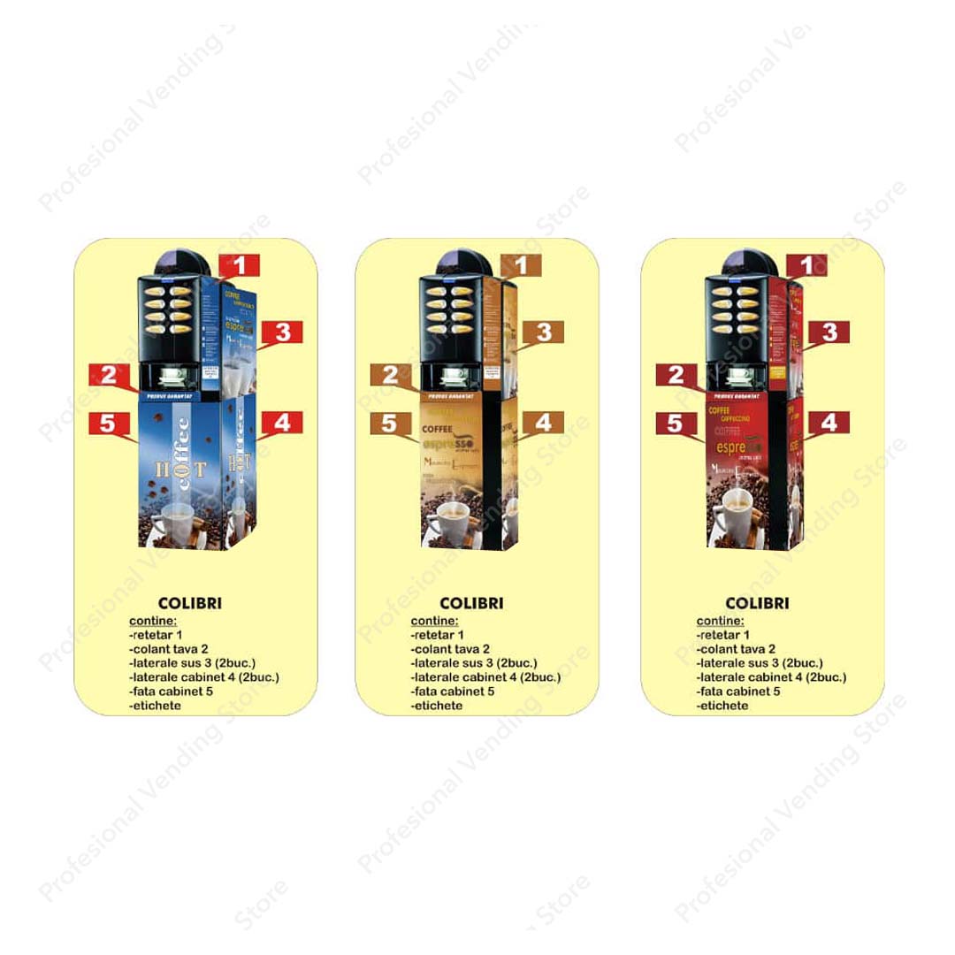 Setul autocolant pentru automate Colibri contine: – retetar 1; – colant tava 2; – autocolante laterale sus 3 (2 bucati); – autocolante laterale cabinet 4 (2 bucati); – autocolant fata cabinet 5; – etichete selectie bauturi.