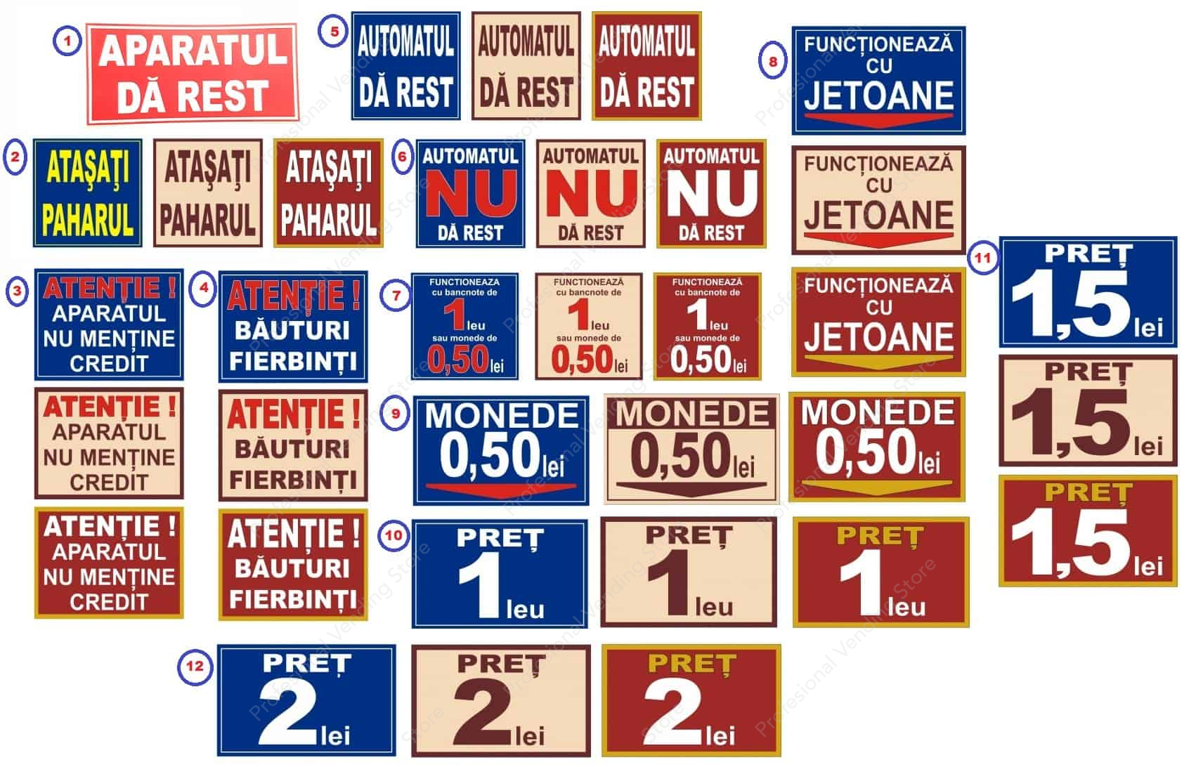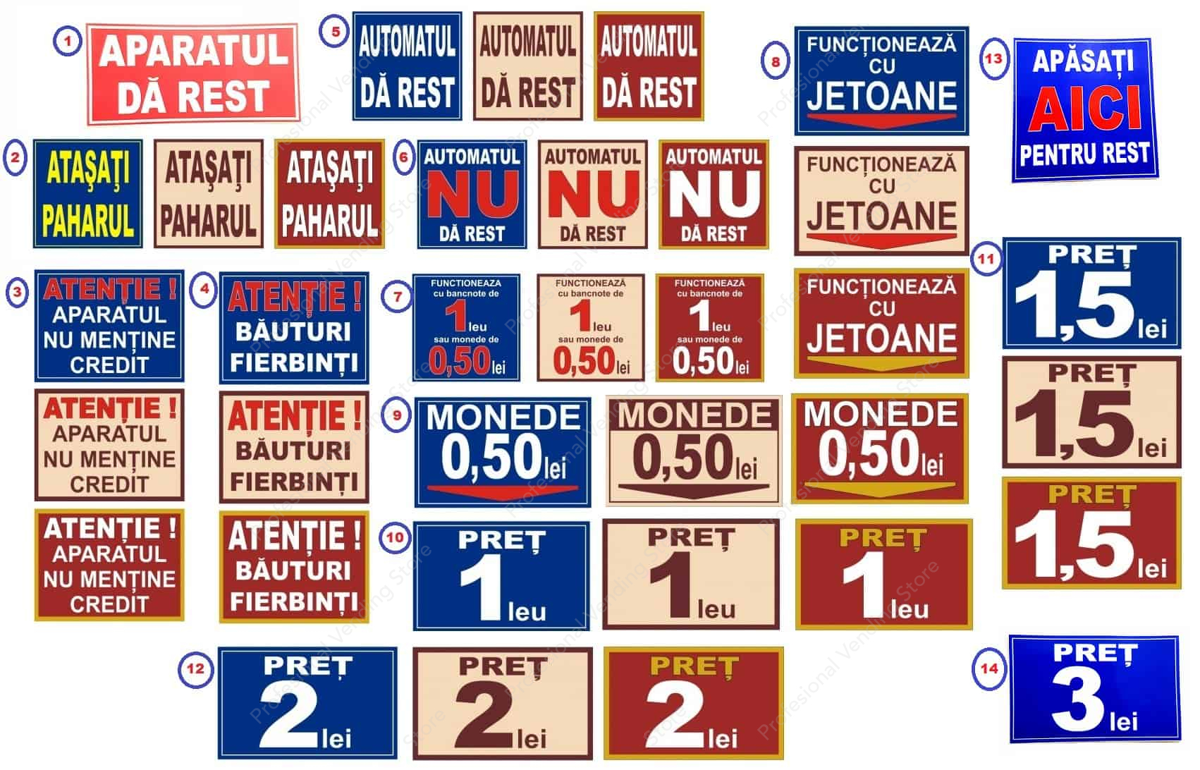 Stickere autoadezive cu diverse mesaje, de dimensiuni mici pentru automatele de tip vending. Pentru a comanda, va rugam sa alegeti modelul de sticker folosind meniul „Model Sticker”, conform numerotarii din imaginea de produs.